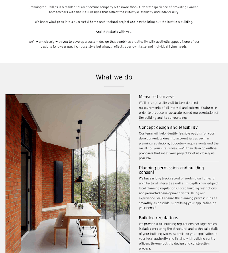 Pennington Phillips is a residential architecture company based in North London. In the past, much of the company's business had come from referrals. So it was looking to attract more prospects by revamping its website with new content and an updated design.